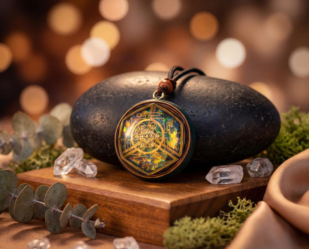 This pendant features a unique combination of natural magnet, copper, and metallic fragments in resin. The natural magnet promotes calmness and reduces stress, while copper enhances circulation, supporting your overall well-being. Together, they create a balanced energetic shield around you.
