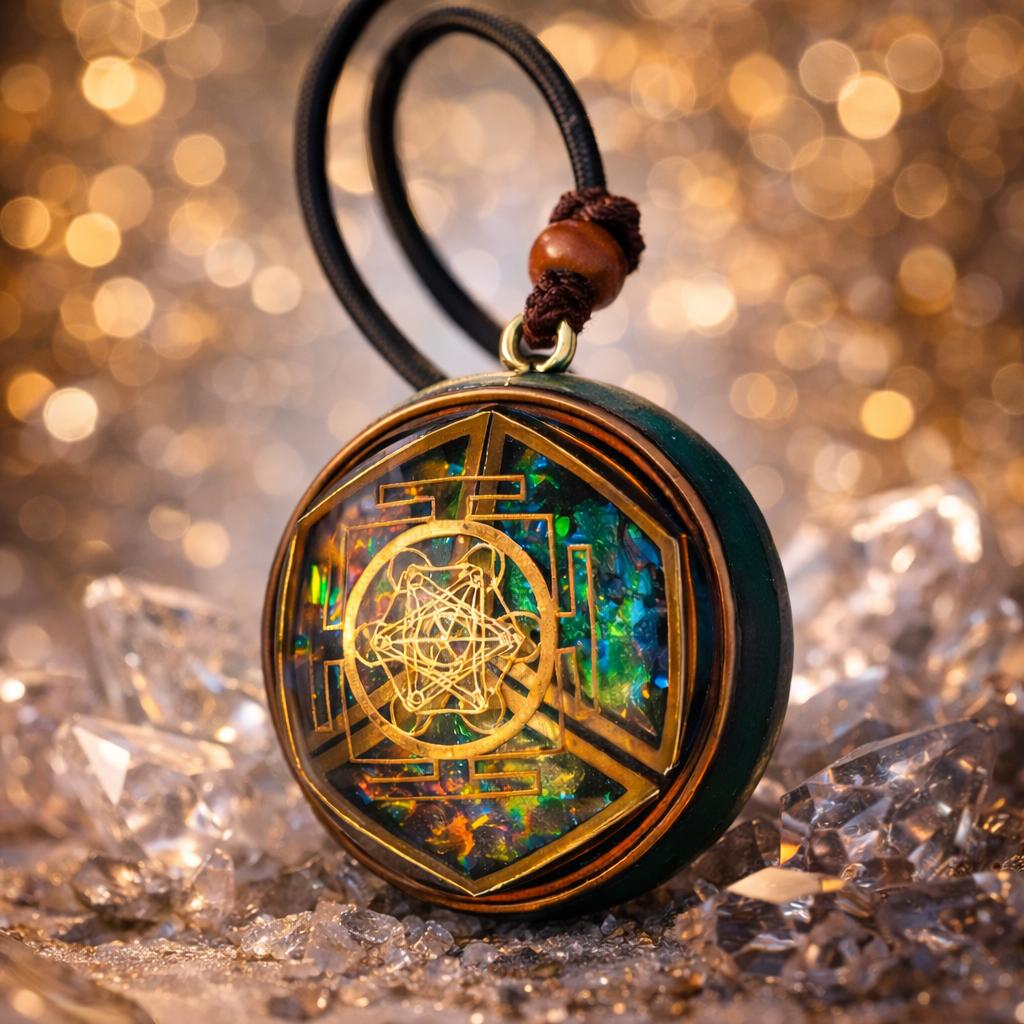 Answer 1: The pendant is made from a natural magnet, copper, and metallic fragments encapsulated in resin. The natural magnet promotes calmness and reduces stress, while copper enhances circulation and overall well-being. The metallic fragments help harmonize surrounding energies, creating a balanced energetic environment.